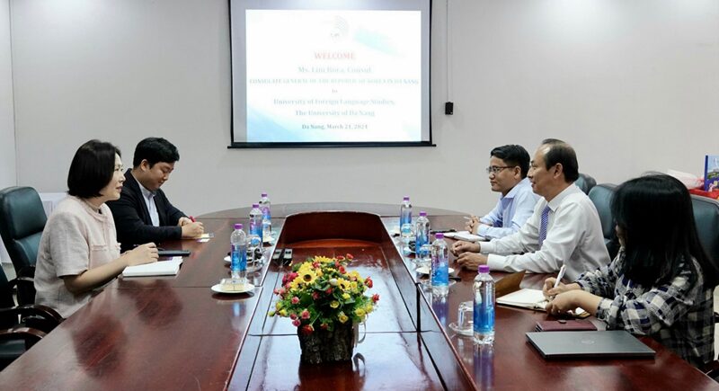 Tại buổi tiếp đón, PGS.TS. Trần Hữu Phúc trân trọng chào mừng và đánh giá cao chuyến thăm của Bà Lim Bora – Tham tán lãnh sự, Lãnh sự quán Hàn Quốc tại thành phố Đà Nẵng cùng đoàn công tác, xem đây là dịp tốt để đại diện lãnh đạo hai bên cùng trao đổi thông tin, cơ hội hợp tác trong các lĩnh vực giáo dục, khoa học và văn hóa. Hiệu trường Nhà trường đã giới thiệu những nét tổng quan, nổi bật về Trường Đại học Ngoại ngữ, Khoa Ngôn ngữ & Văn hóa Hàn Quốc cũng như một số định hướng, nội dung đang và sẽ triển khai hợp tác giữa Nhà trường với các trường đại học của Hàn Quốc, doanh nghiệp Hàn Quốc tại Việt Nam và cả tại Hàn Quốc.