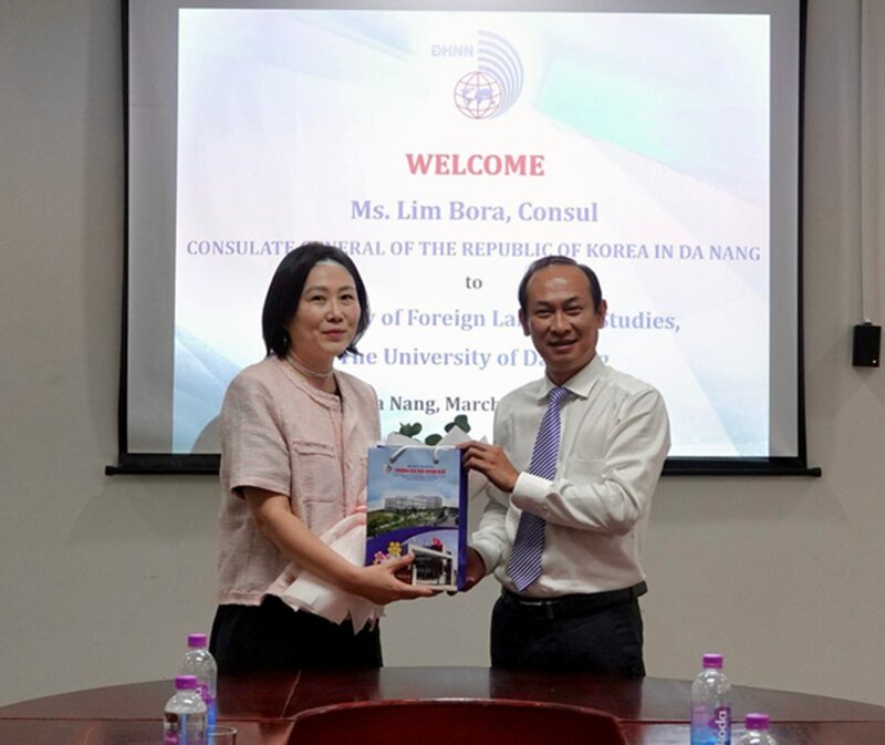 Lãnh đạo Trường Đại học Ngoại ngữ tặng hoa & quà lưu niệm lãnh đạo Tổng Lãnh sự Hàn Quốc tại Đà Nẵng