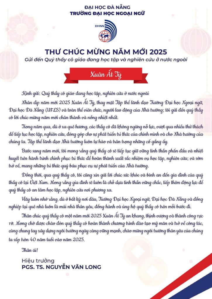 Thư Chúc mừng Năm mới 2025 của Thầy Hiệu trưởng Trường Đại học Ngoại ngữ, ĐHĐN gửi đến Quý thầy cô giáo đang học tập và nghiên cứu ở nước ngoài.