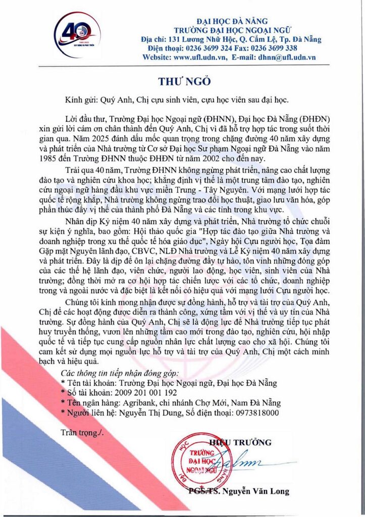 Thư ngỏ tài trợ nhân dịp 40 năm Xây dựng và Phát triển Trường Đại học Ngoại ngữ, Đại học Đà Nẵng