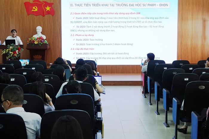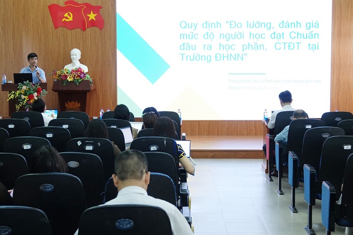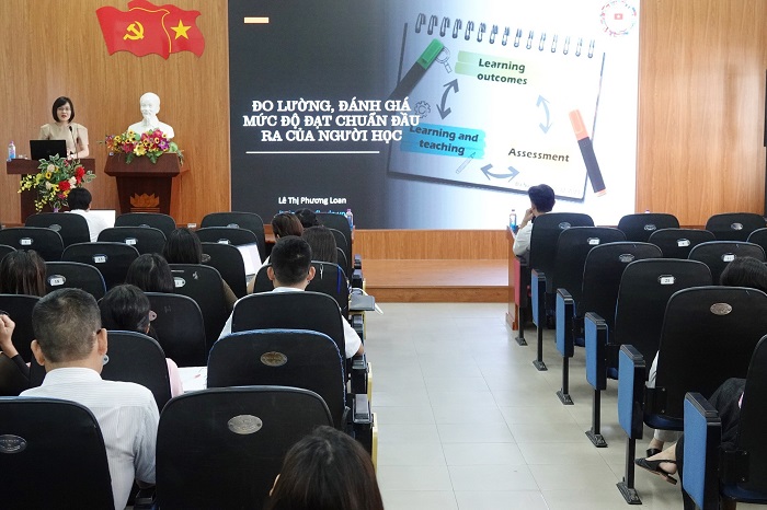 Phó Hiệu trưởng Nguyễn Văn Long nhấn mạnh, trong bối cảnh cạnh tranh đại học ngày càng gay gắt, trường đại học vừa là đơn vị đào tạo thuộc khối hành chính sự nghiệp, vừa là đơn vị nghiên cứu, nhưng một phần cũng là doanh nghiệp. Với tư duy đó, cần nhìn nhận rằng khách hàng của nhà trường là nhà tuyển dụng và sản phẩm của nhà trường chính là sinh viên tốt nghiệp với kiến thức, kỹ năng, thái độ đã qua CTĐT. Với góc nhìn này, mỗi thầy cô sẽ nhìn nhận vai trò của công tác đo lường, đánh giá mức độ người học đạt CĐR của học phần, CTĐT để từ đó nâng cao chất lượng đào tạo.