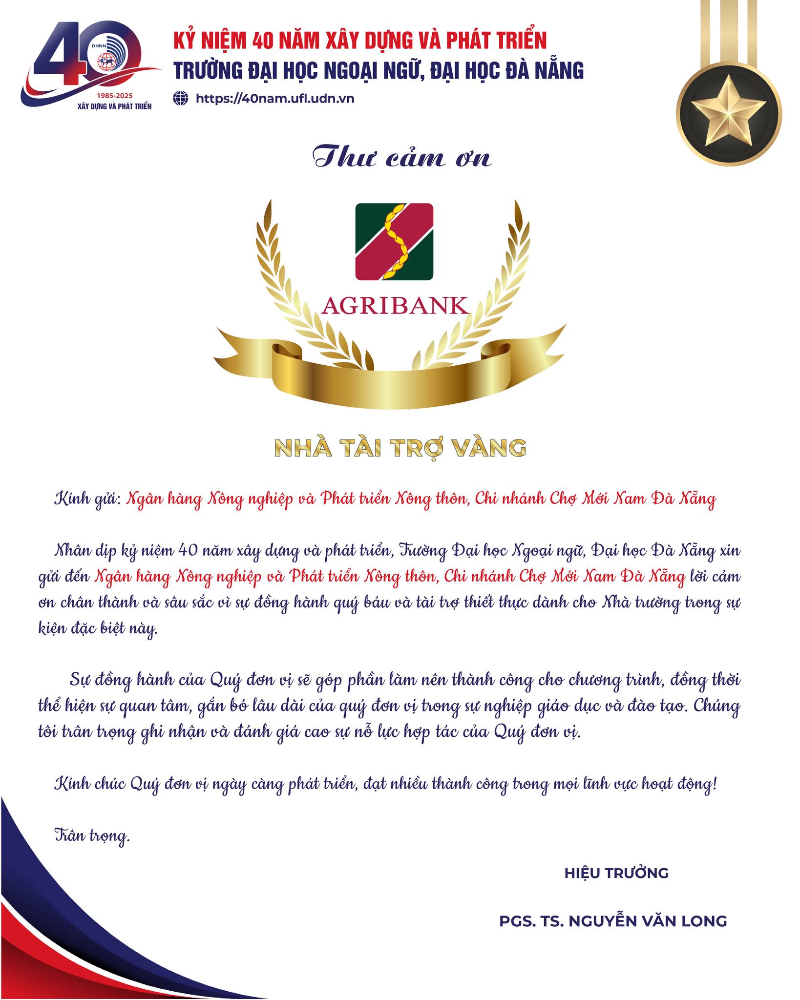 Trang chủ / Tin tức / Trân trọng cảm ơn Ngân hàng Nông nghiệp và Phát triển Nông thôn, Chi nhánh Chợ Mới Nam Đà Nẵng đã đồng hành cùng Trường Đại học Ngoại ngữ, Đại học Đà Nẵng nhân kỷ niệm 40 năm xây dựng và phát triển Nhà trường.