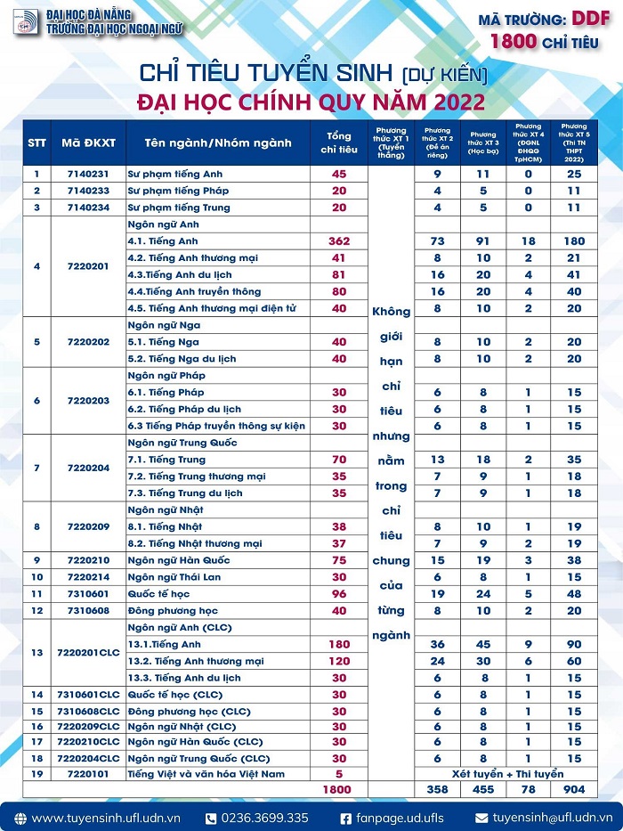Mọi thông tin chi tiết và cập nhật liên quan đến công tác tuyển sinh năm 2022 được Trường đăng tải trên trang Thông tin tuyển sinh tại địa chỉ: http://tuyensinh.ufl.udn.vn