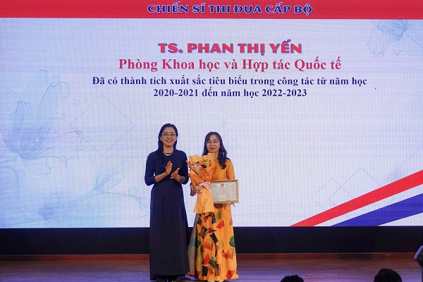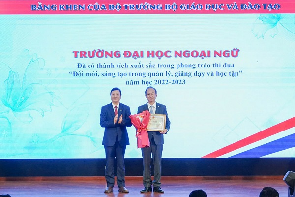 Đại diện Lãnh đạo ĐHĐN được ủy quyền của Bộ GD&ĐT trao bằng khen của Bộ GD&ĐT cho tập thể Trường Đại học Ngoại ngữ