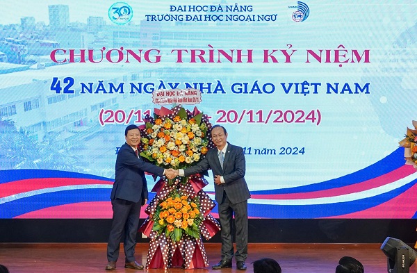 PGS.TS. Lê Quang Sơn – Phó Giám đốc ĐHĐN đại diện lãnh đạo tặng hoa chúc mừng Trường Đại học Ngoại ngữ, ĐHĐN nhân dịp Kỷ niệm 42 năm Ngày Nhà giáo Việt Nam
