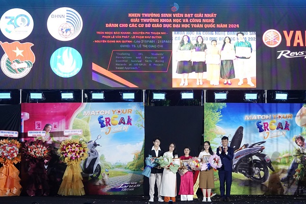 Bên cạnh đó, Nhà trường tuyên dương và khen thưởng nhóm sinh viên đạt Giải Nhất của Giải thưởng Khoa học và Công nghệ dành cho sinh viên trong cơ sở giáo dục đại học năm 2024 vừa qua; đồng thời trao 29 suất học bổng với tổng giá trị học bổng là 87 triệu đồng.