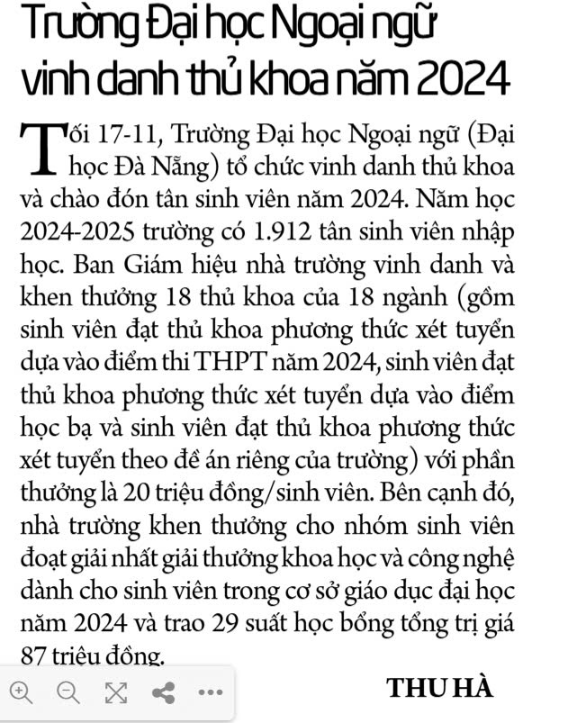 Tại Chương trình, Trường Đại học Ngoại ngữ, ĐHĐN vinh danh và khen thưởng 18 thủ khoa tại 18 ngành. Trong đó, tuyên dương và khen thưởng sinh viên đạt giải Học sinh Giỏi cấp Quốc gia, sinh viên đạt Thủ khoa phương thức xét tuyển dựa vào điểm thi THPT năm 2024, sinh viên đạt Thủ khoa phương thức xét tuyển dựa vào điểm học bạ, và sinh viên đạt thủ khoa phương thức xét tuyển theo đề án riêng của Trường Đại học Ngoại ngữ, ĐHĐN với phần thưởng là 20 triệu đồng/sinh viên. Sinh viên đạt Thủ khoa phương thức xét tuyển dựa vào kết quả kiểm tra trình độ năng lực của Đại học Quốc gia Thành phố Hồ Chí Minh năm 2024 và Thủ khoa các ngành đào tạo được vinh danh và khen thưởng với phần thưởng là 10 triệu đồng/sinh viên.