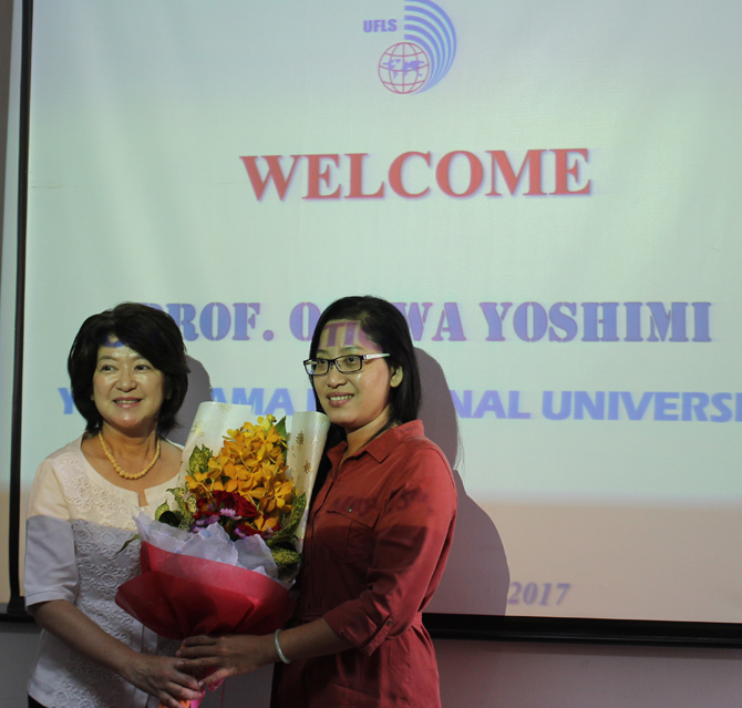 TS. Đào Thị Thanh Phượng – Phó Hiệu trưởng Nhà trường tặng hoa cho đại diện Trường Đại học Quốc gia Yokohama.