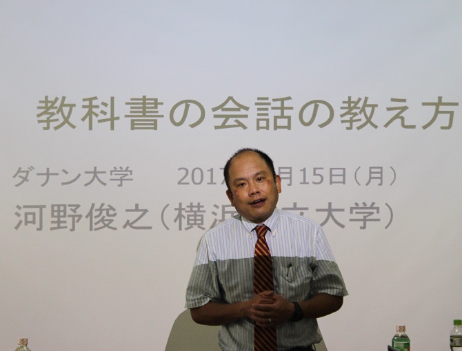 TS. Ngô Quang Vinh – Trưởng Khoa tiếng Nhật-Hàn-Thái phát biểu gửi lời cảm ơn đến 2 giáo sư của Đại học Quốc gia Yokohama và chia sẻ những thuận lợi và khó khăn trong quá trình giảng dạy bộ môn tiếng Nhật tại trường Đại học Ngoại Ngữ – Đại học Đà Nẵng.