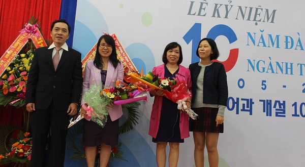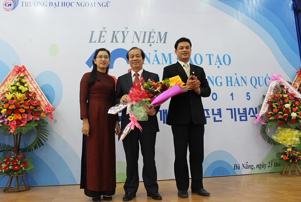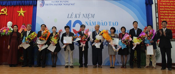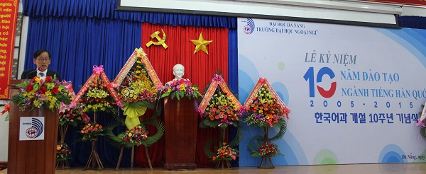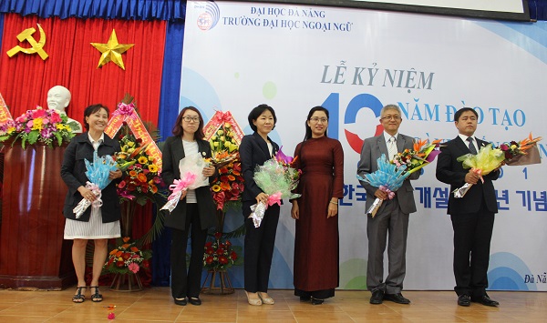 Tại buổi lễ, TS. Trần Hữu Phúc – Hiệu trưởng Nhà trường đã biểu dương những thành tích của Tổ Tiếng Hàn đã đạt được trong 10 năm qua, nhấn mạnh đây là chặng đường rất đáng trân trọng và tự hào của một Tổ còn non trẻ. Thầy Hiệu trưởng tin tưởng rằng, trong thời gian tới, Tổ sẽ phát huy truyền thống, tiếp tục nỗ lực phấn đấu hoàn thành nhiệm vụ của ngành và Nhà trường, tích cực đổi mới phương pháp dạy và học, phát huy tính tích cực, chủ động, sáng tạo của đội ngũ giảng viên và sinh viên góp phần thực hiện tốt việc đổi mới căn bản, toàn diện giáo dục và đào tạo và phấn đấu đạt được nhiều thành tích hơn nữa để xứng đáng với bề dày truyền thống 30 năm Trường Đại học Ngoại ngữ – Đại học Đà Nẵng. “Qua 10 năm hoạt động Trường đã đào tạo, cung cấp cho xã hội 350 cử nhân tiếng Hàn Quốc, được nhà tuyển dụng đánh giá cao. Nhiều sinh viên ngành tiếng Hàn Quốc đạt thành tích xuất sắc trong học tập và giành nhiều giải thưởng lớn trong các kỳ thi quốc tế, quốc gia như: ‘Rung chuông vàng tiếng Hàn Quốc toàn quốc’, ‘Nói tiếng Hàn Quốc năm 2014’, giải Nhất cuộc thi ‘Quiz on Korean’,… Đội ngũ cán bộ, giảng viên tiếng Hàn Quốc của Trường chủ yếu được bồi dưỡng chuyên môn, nghiệp vụ ở nước ngoài. Hiện có 2 cán bộ đang học Tiến sĩ và 4 cán bộ học Thạc sĩ tại Hàn Quốc. Đến nay, Nhà trường đã ký biên bản ghi nhớ về việc trao đổi, giao lưu học thuật, văn hóa với 4 trường đại học của Hàn Quốc gồm: Đại học Chung Ang, Đại học Giáo dục Pusan, Đại học Myongji và Đại học Daegu Catholic cùng nhiều tổ chức, doanh nghiệp khác nhằm nâng cao chất lượng đào tạo sinh viên. 10 – một chặng đường chưa phải là dài nhưng thành quả mà ngành Tiếng Hàn Quốc đã đạt được thật đáng tự hào. Chặng đường phía trước của Ngành tiếng Hàn Quốc sẽ còn nhiều gian truân, thử thách, song với sức mạnh đã kết nối 10 năm qua của Ngành tiếng Hàn Quốc và 30 năm truyền thống của Nhà trường sẽ là hành trang vững bước cho một thời kỳ phát triển mới trong sự phát triển không ngừng của Trường Đại học Ngoại ngữ – Đại học Đà Nẵng”.
