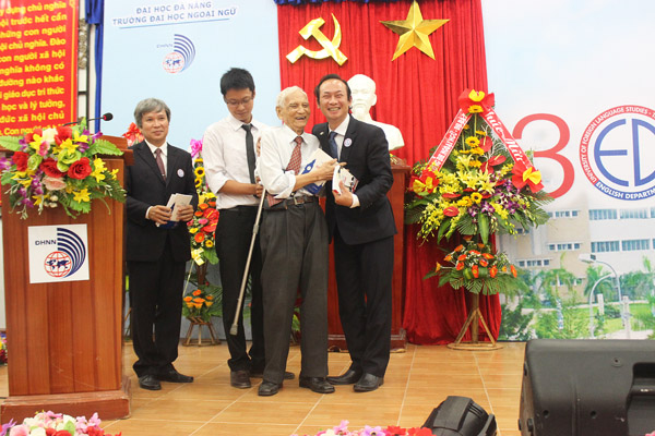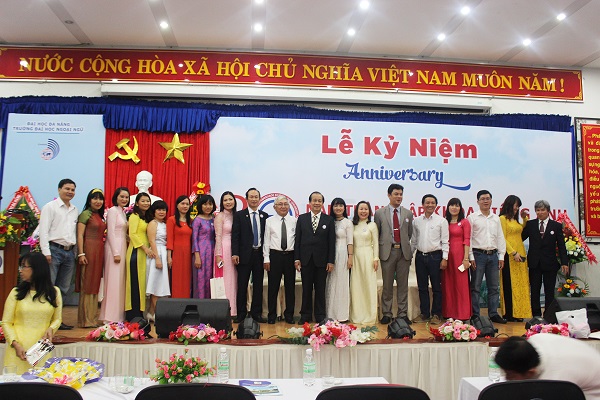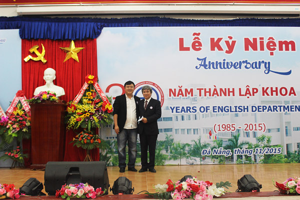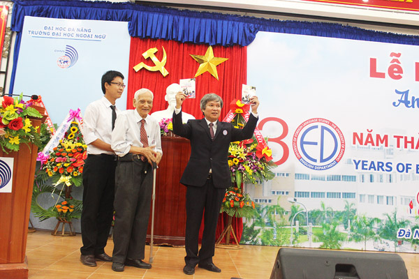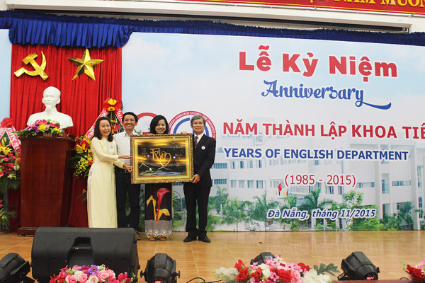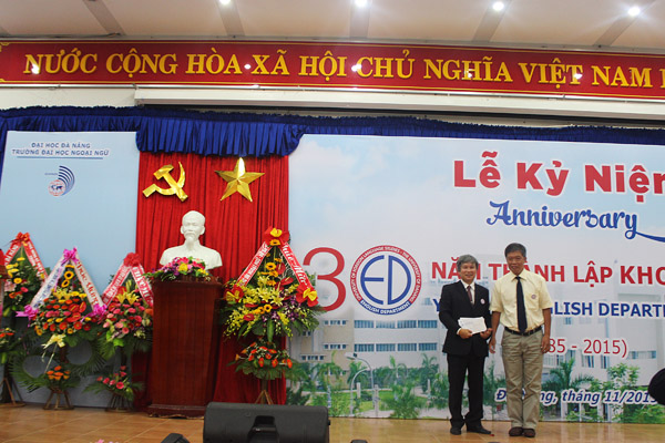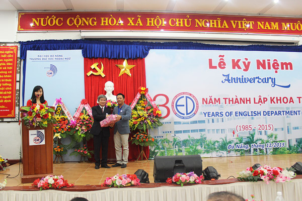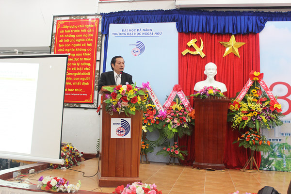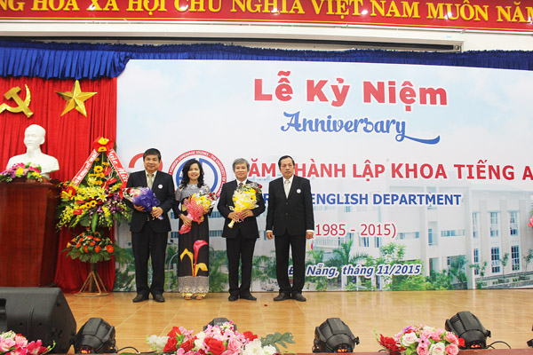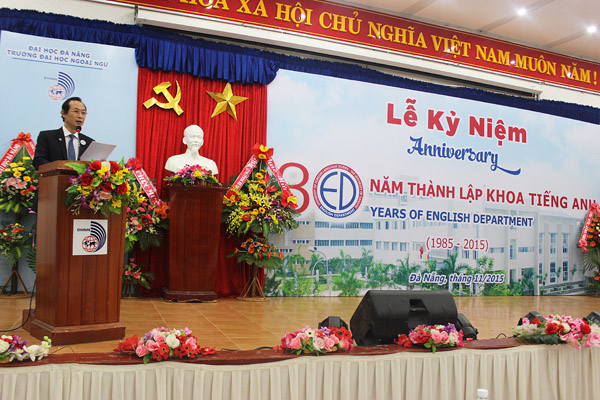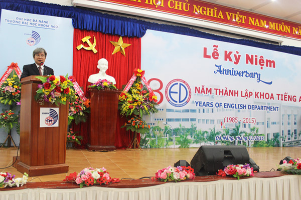 Cũng tại buổi lễ, PGS.TS. Ngô Văn Dưỡng-Phó Giám đốc Đại học Đà Nẵng phát biểu: “Là một đại học vùng trọng điểm quốc gia, thực thi sứ mệnh “hun đúc trí tuệ và tài năng vì sự phát triển của miền Trung và Tây Nguyên”, với bề dày truyền thống 40 năm của cơ sở giáo dục thành viên và 21 năm xây dựng phát triển đại học vùng (1994-2015), Đại học Đà Nẵng ngày nay thực sự là trung tâm đào tạo đại học và sau đại học đa lĩnh vực, đa ngành, trung tâm NCKH và chuyển giao công nghệ của cả nước. Trong đó, Trường Đại học Ngoại ngữ nói chung và Khoa tiếng Anh đã có những đóng góp to lớn vào sự nghiệp nâng cao học hiệu của Đại học Đà Nẵng, chung tay thực hiện nhiệm vụ đào tạo nhân lực, bồi dưỡng nhân tài, phục vụ đắc lực cho công cuộc phát triển kinh tế-xã hội của đất nước cũng như của miền Trung Tây Nguyên và thành phố Đà Nẵng. Đảng ủy, Ban Giám Đốc Đại học Đà Nẵng trân trọng những đóng góp to lớn của tập thể thầy và trò Khoa tiếng Anh trong suốt chặng đường 30 năm xây dựng và phát triển và tin tưởng rằng tập thể khoa Tiếng Anh sẽ phát triển nhanh và bền vững góp phần vào chiến lược phát triển của trường Đại học Ngoại ngữ cũng như của Đại học Đà Nẵng.”