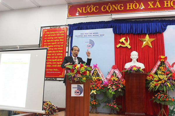 PGS.TS. Phan Văn Hòa – Nguyên Hiệu trưởng Nhà trường, người đã dày công lèo lái con thuyền Khoa Tiếng Anh vượt qua bao chặng đường khó khăn đã phát biểu ôn lại lịch sử phát triển Khoa tiếng Anh đồng thời bày tỏ lòng biết ơn sâu sắc tới các thầy cô giáo, những người đã đặt những viên gạch đầu tiên cho nền móng vững chắc của ngôi nhà Khoa tiếng Anh. Bài phát biểu đã khiến cả Hội trường như trở lại 30 năm trước, cùng sống lại vô vàn những khó khăn, thách thức mà Khoa đối mặt từ ngày đầu thành lập. Cũng qua những chia sẻ ấy, chúng ta càng thêm trân trọng, cảm phục sự tâm huyết, trách nhiệm và tầm nhìn chiến lược của Ban Giám hiệu Nhà trường và lãnh đạo Đại học Đà Nẵng đối với sự phát triển Khoa tiếng Anh Trường Đại học Ngoại ngữ – Đại học Đà Nẵng.